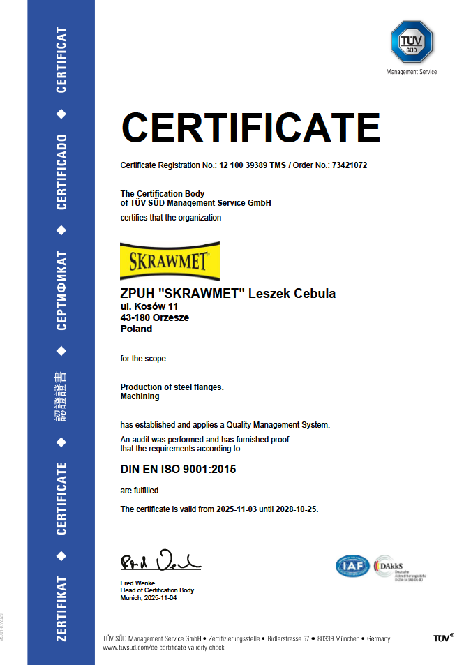 Quality Management System Certificate PN EN-ISO 9001: 2015 issued by TUV SUD