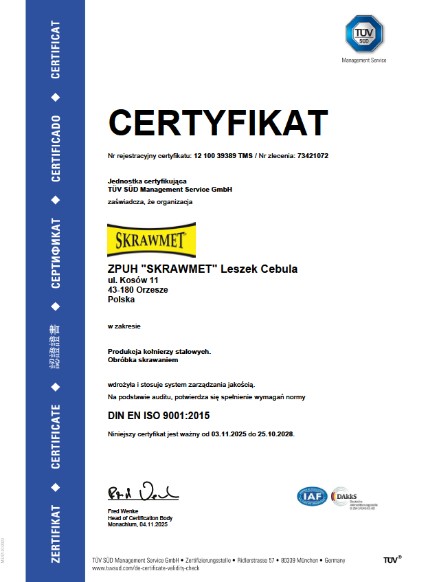 Certyfikat Systemu Zarządzania Jakością PN EN-ISO 9001:2015 wydany przez TUV SUD